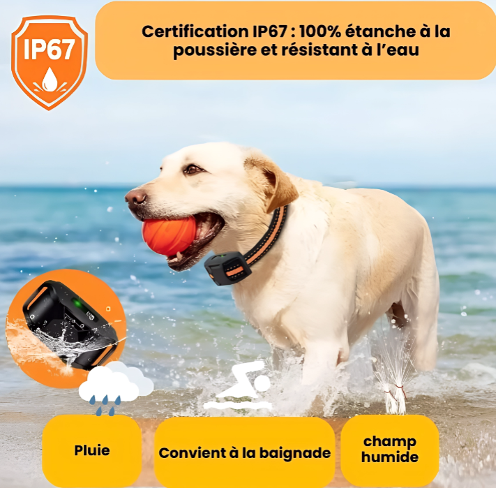 Oui, il est certifié IP67, ce qui le rend résistant à l’eau : votre chien peut se doucher, nager ou jouer sous la pluie sans problème.