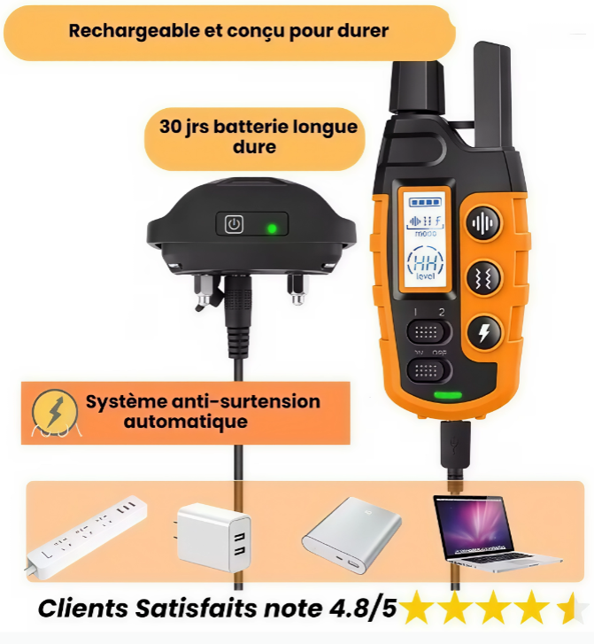 Après seulement 2 à 3 heures de charge, le collier peut durer 15 à 60 jours selon la fréquence d’utilisation.